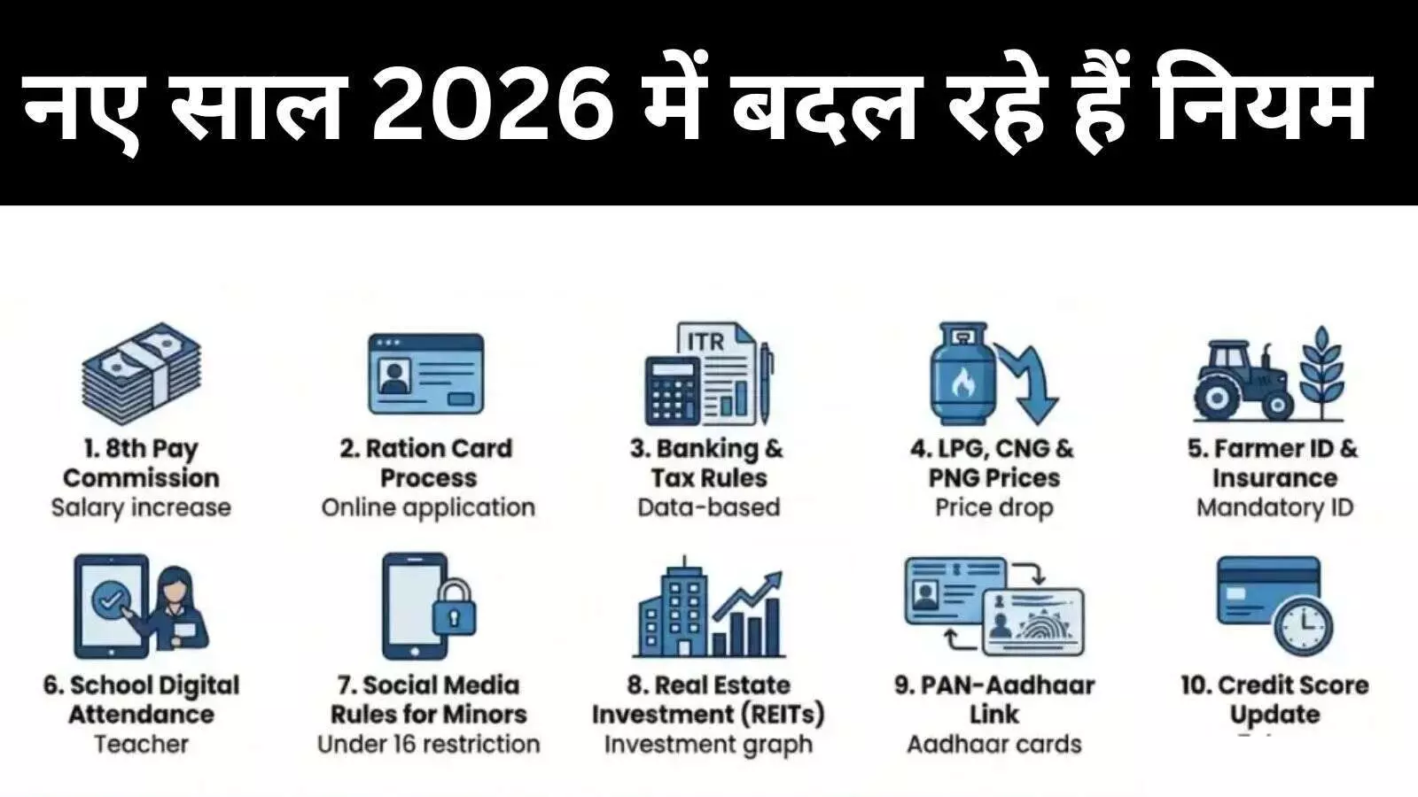 1 जनवरी 2026 से 8वां वेतन आयोग, PAN-आधार लिंकिंग, राशन e-KYC और गैस कीमतों में बदलाव लागू। जानें नए साल में क्या बदल सकता है।
